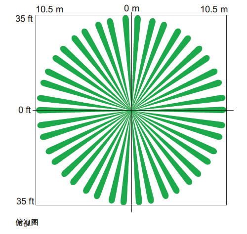 探測器安裝高度為 3 米(10 英尺)時,探測范圍直徑為 15 米(50