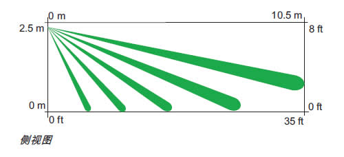 探測器安裝高度為 2.4 米(8 英尺)時,探測范圍直徑為 12 米(40